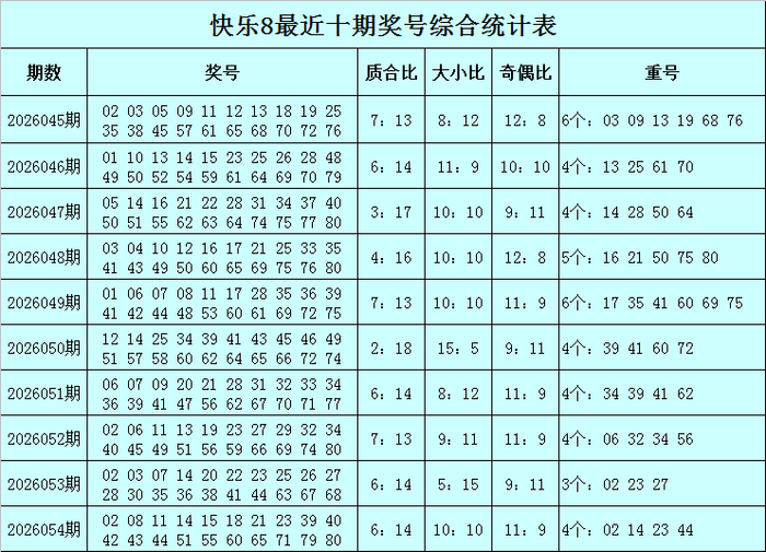 福彩惬心8第2026054期开出奖号:02 08 11 14 15 18 21 23 39 40 42 43 44 51 55 60 65 71 79 80,其中奖号质合比为6:14,四区比为6:4:6:4,包含4个重号02、14、23、44,包含连码14 15、39 40、42 43 44、79 80,包含7个邻号08 15 21 39 40 42 43。