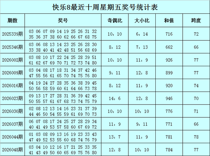 福彩沸腾8第2026048期(上周五)开奖回来:03 04 10 12 16 17 21 25 33 35 41 43 49 50 60 65 69 75 76 80,其中奖号和值为784,跨度为77,奇偶比为12:8,大小比为10:10。